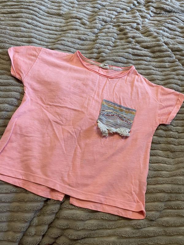 Укорочена футболка на дівчинку, легенька, по бірці 128-й розмір. Заміри: довжина - 42 см груди -77 см
