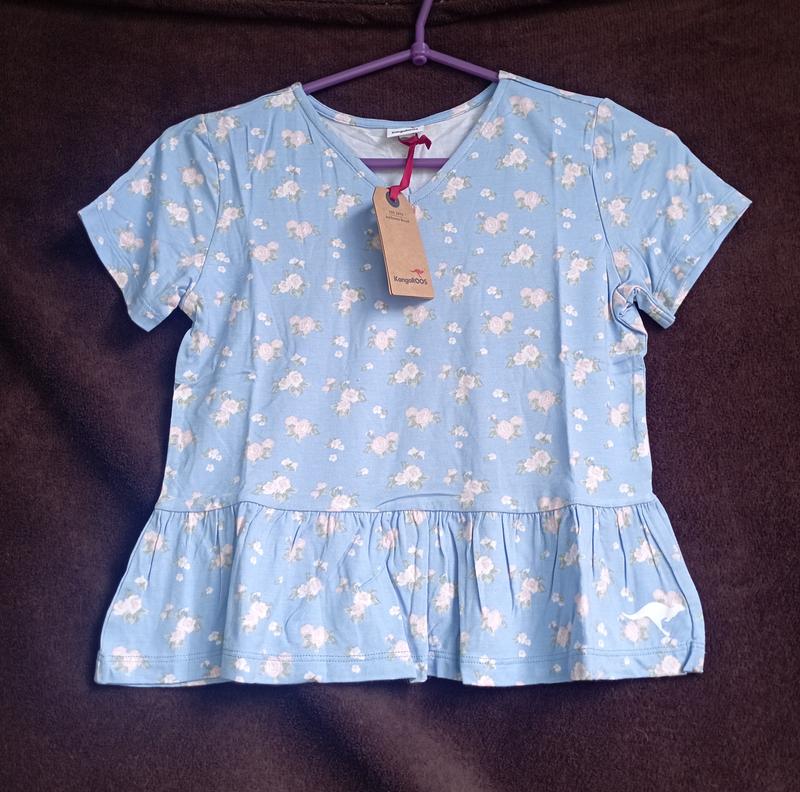 Новая с этикетками Качество классное, 95% вискоза, 5% эластин Очень мягкая, гладкая, холодящая, с красивой оборочкой, есть логотип кенгуру впереди Полуобхват груди 39-48 см Длина 46 см Цвет красивый голубой, в бежевую розочку с зелёными лепестками Фото не передаёт красоту этой футбол очки, очень крутая
