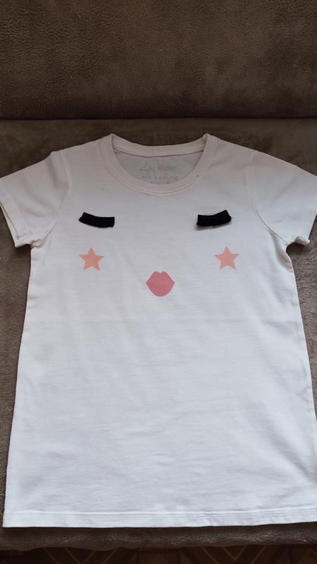 Біла футболка на дівчинку фірми Next в ідеальному стані. З імітацією обличчя: вії, губки, щічки. Тканина полотна, не розтягується, не втягується. Довжина 50 см, ширина 35 см