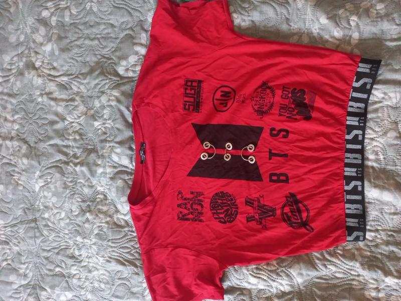 Футболка для поклонницы корейской группы BTS. Состояние нормальное, длина 47, плечи 42, пог 46. Низ футболки на принтованной резинке.