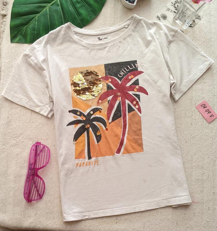 Красивая белая футболка с принтом пальмы и пайетки под мышки 41-48 возраст: 8 лет. будет 9-10 лет есть снизу 2 микро пятна отправка вещей от 80 грн 🚩🚩🚩