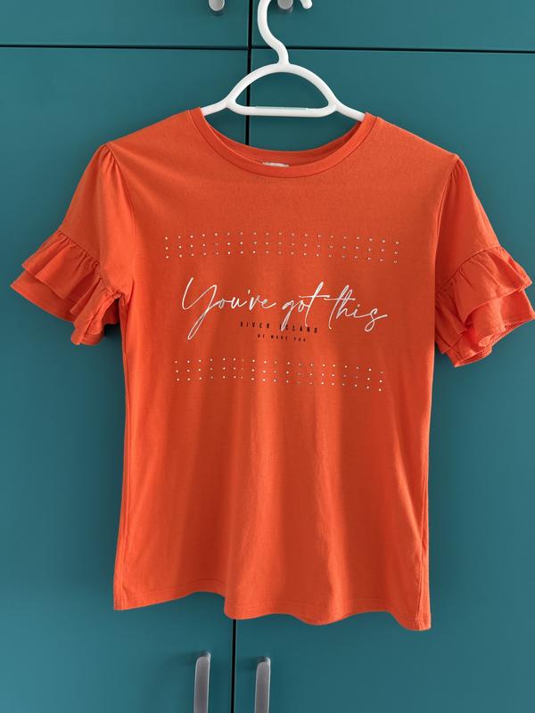 🍊 літня футболка яскрава помаранчева з написом для дівчинки 9-10 років 🥭 довжина см, ПОГ 40-42 см, ПОТ 38 си, ширина 40 см. 🏷️ склад 100% котон /бавовна