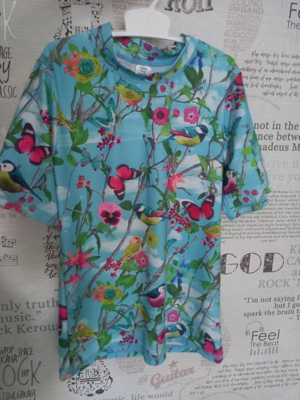 Яскрава футболка Next 🐦 Приятная к телу. Удобна для спорта. Для девочки 13-ти лет. Длина - 54 см Полуобхват груди - 37 см