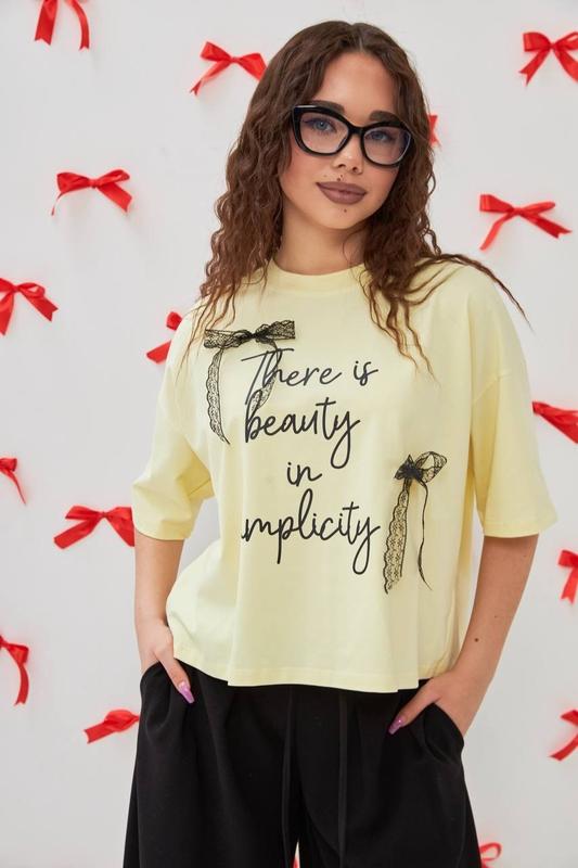 Футболка овер с кружевными бантиками вкорочена модель Ткань-кулир Очень хорошего качества! рост/длин.футб/пог похибка+-2см 140-146/42/54 146-152/44/55 152-158/47/56 158-164/50/57 164-170/54/58