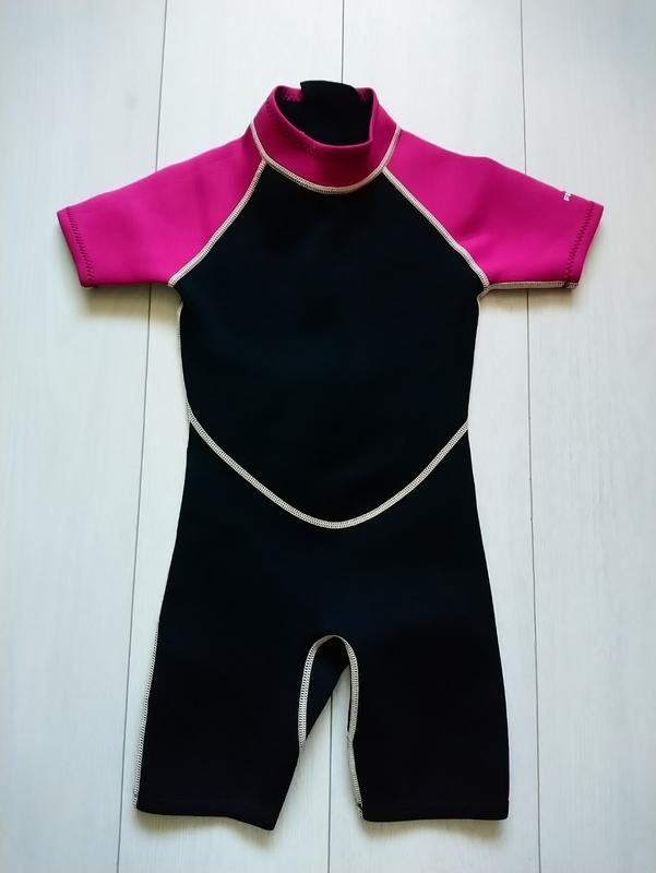 В очень хорошем состоянии. Товщина неопрену 2 мм. На возраст 8 лет. Высота от плеча до низа 67 см, до паха 57 см. От горловины до паха 49 см. Под руками 32 см. Полуобъем пояса 28 см, бедер 32 см