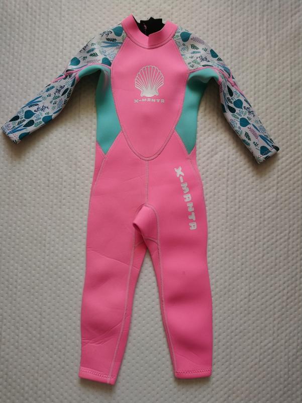 В очень хорошем состоянии. Товщина неопрену 2,5 мм. Размер S на возраст около 4-5 лет. Высота от плеча до низа 80 см, до паха 48 см. От горловины до паха 42 см. Под руками 28 см. Полуобъем пояса 23 см, бедер 27 см. Рукав от шеи 37 см.