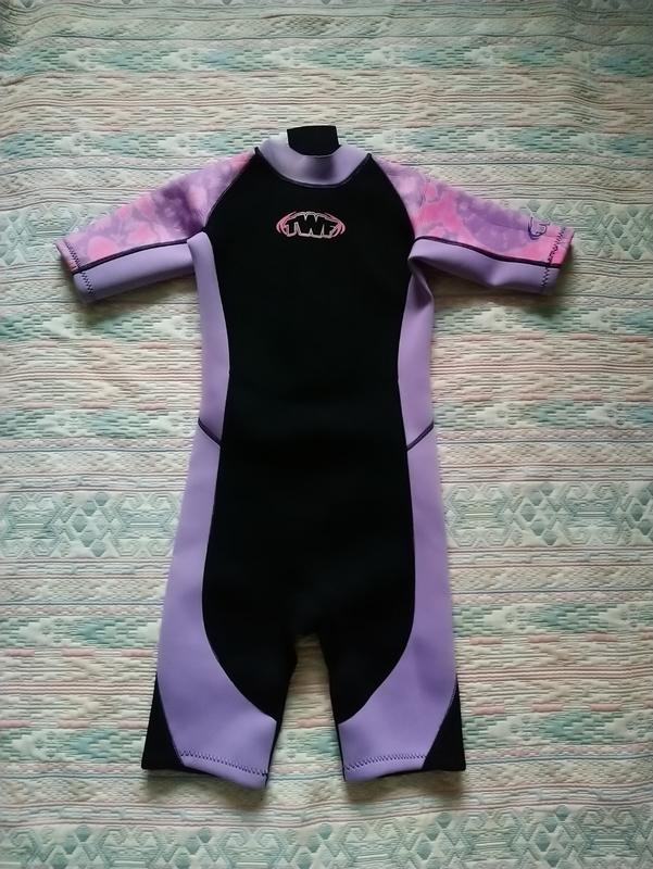 В очень хорошем состоянии. Товщина неопрену 2,5 мм. Размер К14. Высота от плеча до низа 80 см, до паха 66 см. От горловины до паха 61 см. Под руками 37 см. Полуобъем пояса 31 см, бедер 36 см