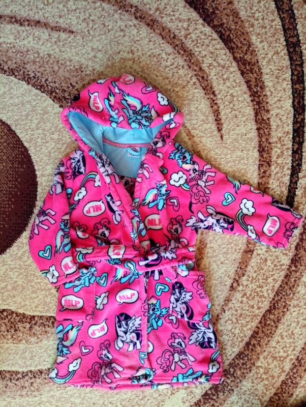 Теплий халат на дівчинку My little pony 💞 З кишенями та капюшоном, по спинці резинка на поясі, хомути вшиті. Довжина 60 см, рукав 31см.