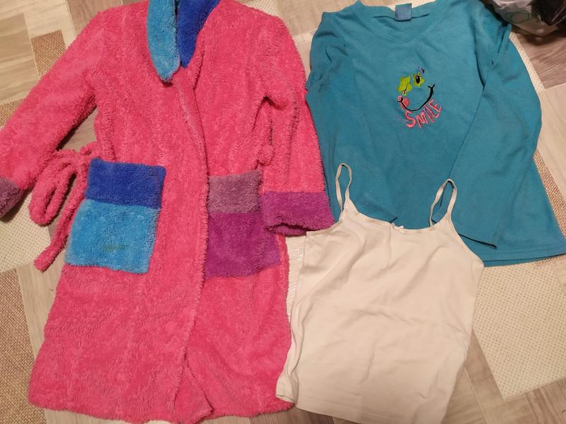 халат на рост 125-135+ длина 83 в груди 45+ рукав 46 флиска длина 56 в грудь 44 рукав 55 и маечка состояние чистое без ньюансов цена за одну вещь вам выйдет 50гр продажа только комплектом 150гр без торга! почта укр и новая