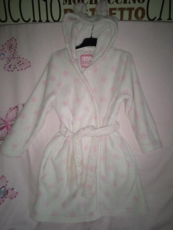 Очень красивый теплый халатик с ушками беленький в розовую звездочку сверху бархат по низу платок есть карманы, мягко используемые как игрушку подушку Длина 78 Длина рукава 44 НПОГ 45 НпОС 46