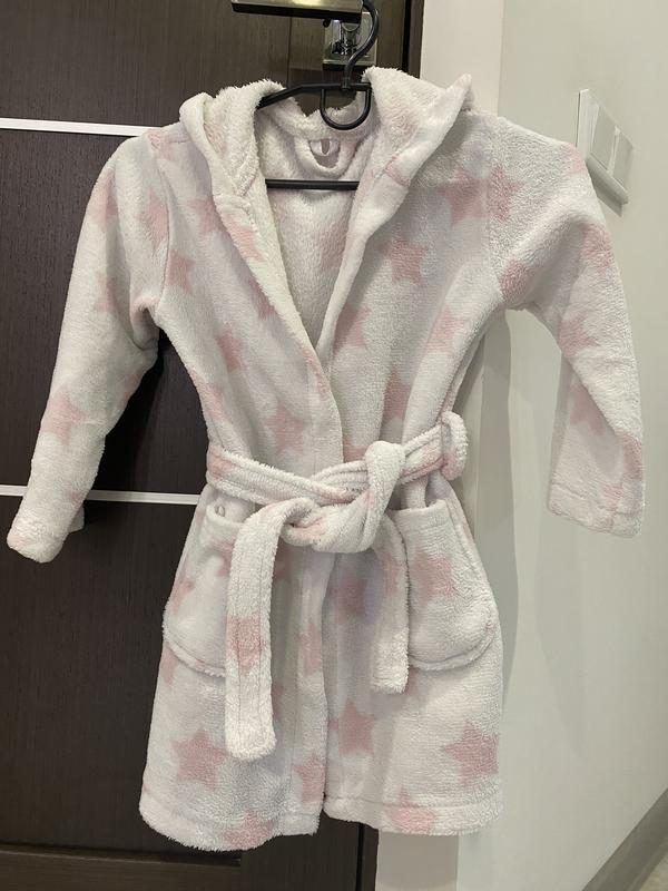 Ніжний халатик для дівчинки Розмір 110-116 (реально буде до 134 за рахунок гарної довжини по спинці і довжини рукава) Довжина по спинці: 67 см Об‘єм грудей: 40 см Довжина рукава від плеча: 39 см
