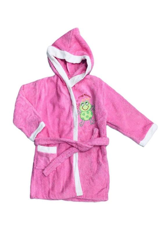 Очень удобный и теплый махровый халат для принцесс. Халатик в розовом цвете с аппликацией веселой лягушки.
