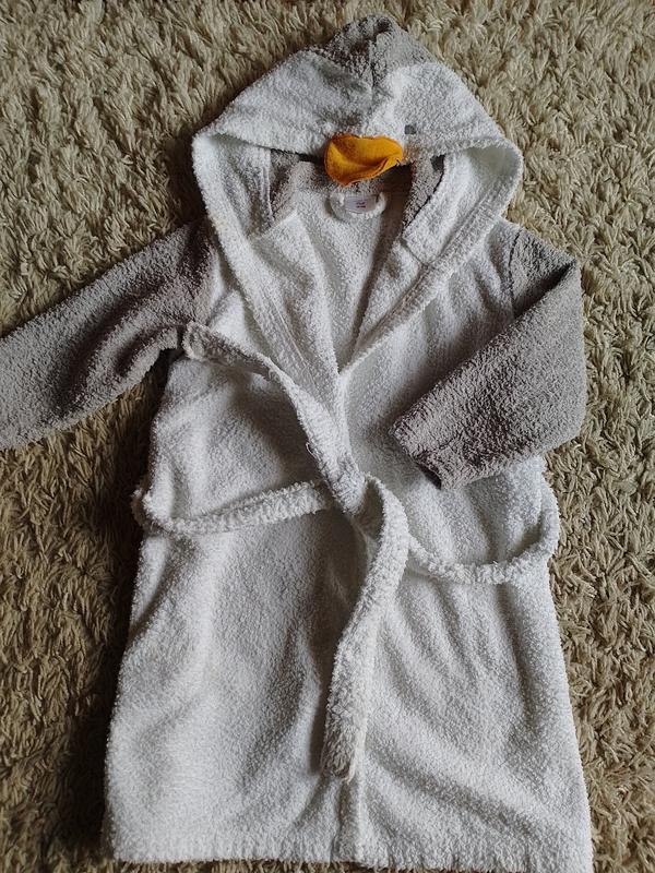 Фирменный качественный махровый халат на 4-6 лет в отличном состоянии, капюшон пингвинчик) Длина без капюшона 65см, рукав 32