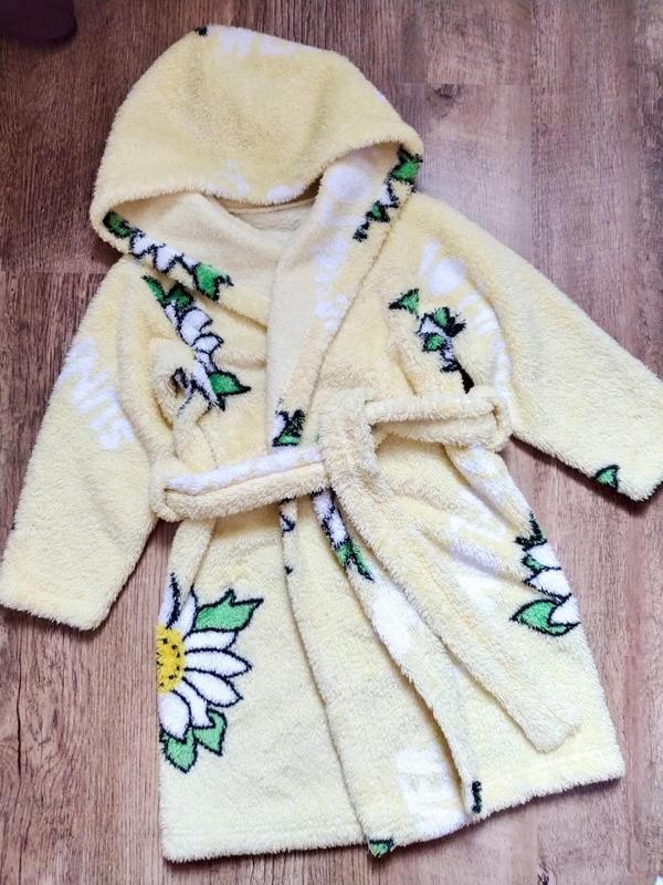 Плюшевий тепленький халат для дівчинки в чудовому стані. Колір в реальностінасичений жовтий, фото висвітлює не передає. Заміри на фото.