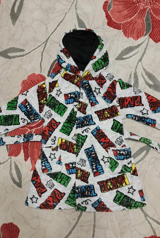 # 16 Мягкий теплый халатик с капюшоном для мальчика 2-4 лет. На рост до 105 см. Пояс вшит. С карманами. Стан идеален. Ширина плечей 32 см Полуобхват груди 36 см Ширина поясу 30 см ( ззаду резинка) Длина рукава 33 см Длина 61 см.