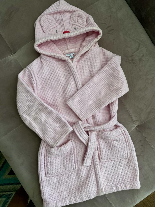 Халат фірмовий, «вафелька», всередині махра. Стан ідеальний, пояс ззаді резинка, спереді завʼязка. Капішон мишка. Заміри: рукав - 42, довжина-57.