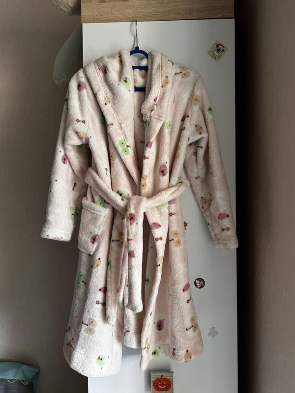 Халатик очень мягкий и теплый, состояние идеальное. Замеры: длина 71 см., пог 41 см., длина рукава 42 см. Состав: 100% полиэстер. Размер указан на 5-6 лет, но реально его можно дольше носить.