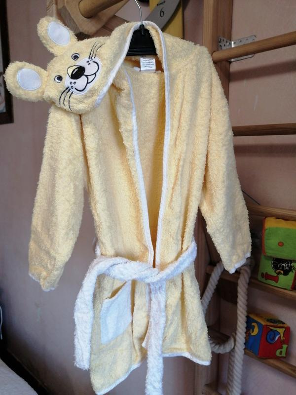 Махровый хлопковый халатик, нежно желтого цвета, не жесткий. В очень хорошем состоянии, без пятен. Одевали пару раз, две стирки. Склад 100 бавовна.