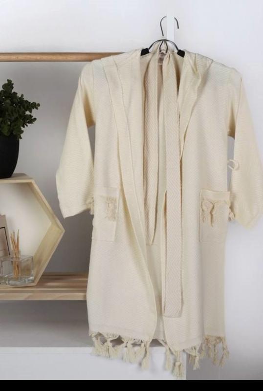 Халат дитячий ніжного кремового кольору, дуже стильний та оригінальний. В наявності розміри 4/6, 6/8. Розмір приблизно відповідає віку дитини. Країна виробник: Туреччина Матеріал: рогожка ялинка Склад: 100 % котон Є ще в помаранчевому і графітовому кольорах. Розмір: 4/6 Ширина плечей: 36 см Напівобхват грудей: 37 см Напівобхват талії: 37 см Напівобхват стегон: 37 см Довжина рукава: 42 см Довжина виробу: 70 см Розмір: 6/8 Ширина плечей: 38 см Напівобхват грудей: 39 см Напівобхват талії: 39 см Напівобхват стегон: 40 см Довжина рукава: 44 см Довжина виробу: 76 см