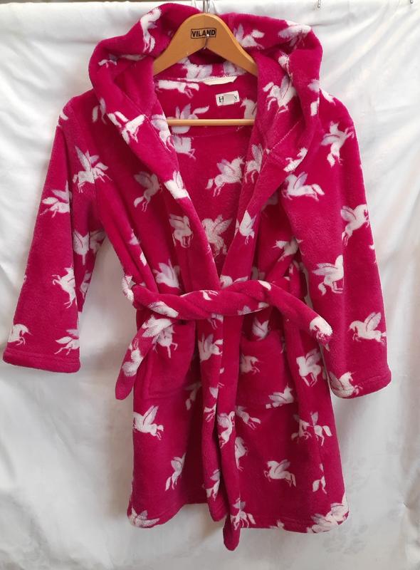 Домашний пушистый халат HATLEY для девочки Ярко малинового цвета с белыми единорогами, цвет на фото не получился, все оттенки за счет качества фото В идеальном состоянии, практически новый 2 кармана, пояс, капюшон Размер по бирке L на 6/7 лет, ориентируйтесь по замерам. Ширина (на уровне груди) полочки – 27 см, по спинке – 50 см Длина рукава – 43 см Длина по спинке – 73 см