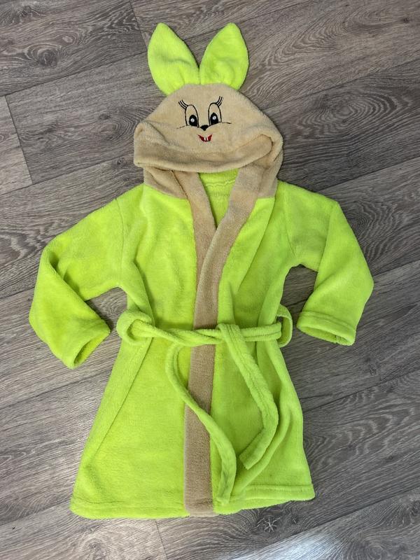 Дитячий халатик, неоново салатного кольору. На возраст от 1 до 5 лет. В идеальном состоянии. Длина 55 см, рукав по внешнему шву 33 см, по внутреннему 27 см.