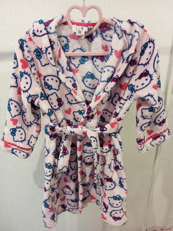 Дуже милий, теплий велюровий халатик для дівчинки. Ніжно рожевого кольору в принт хелоу кіті. З капюшоном, на ньому є шушка з милим бантиком, є кишені і пояс. По бірці на 6-7 років, зріст 122 плечі 37 рукав 42 довжина 75 Пот 36 Стан чудовий
