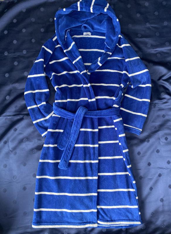 Теплий халат з капюшоном, синій Стан: Відмінний, без дефектів Матеріал: М’який фліс, дуже приємний до тіла Колір: Яскраво-синій з білими горизонтальними смужками Особливості: Має капюшон, зручний пояс і дві кишені Ідеальний для дому, після душу або як подарунок. Носився дуже мало.
