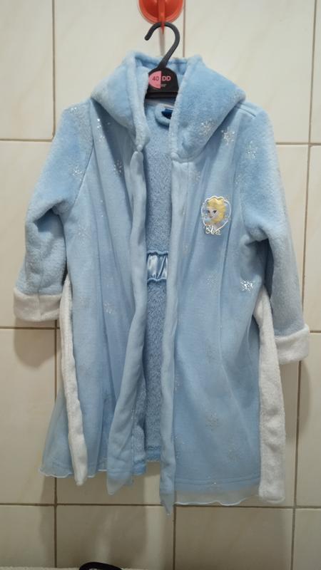 Халат холодное сердце в идеальном состоянии жаль что фотокарта не может эту красоту передать цвет голубой снежинки с блеском на халате и на сеточке сверху. Размер на 3-4 года.