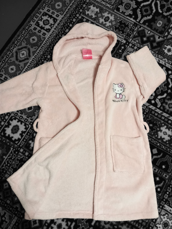 Дитячий халат Hello Kitty. Мягкий и удобный халат с милым принтом Hello Kitty. Идеален для дома, после ванны или перед сном. Бренд/тематика: Hello Kitty Размер: 7–8 лет (рост 128 см) Материал: 100% полиэстер Особенности: легкий, мягкий, теплый Нюанс: в двух местах нужно зашить ~5 см Без пояса. ✨ Стильный и комфортный вариант для ребенка.