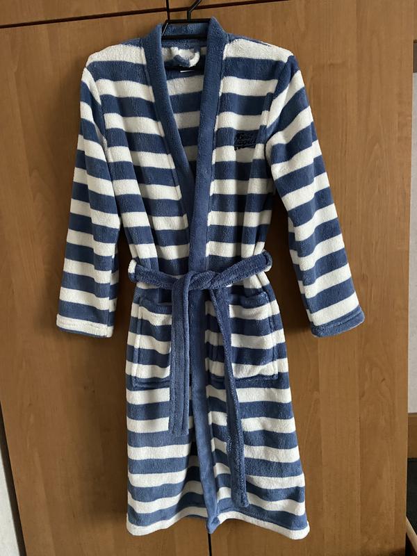 Халат махровий (підлітковий), ідеальний стан, синьо-білий колір,, на запах + пояс, ріст 146 - 152., заміри на фото.