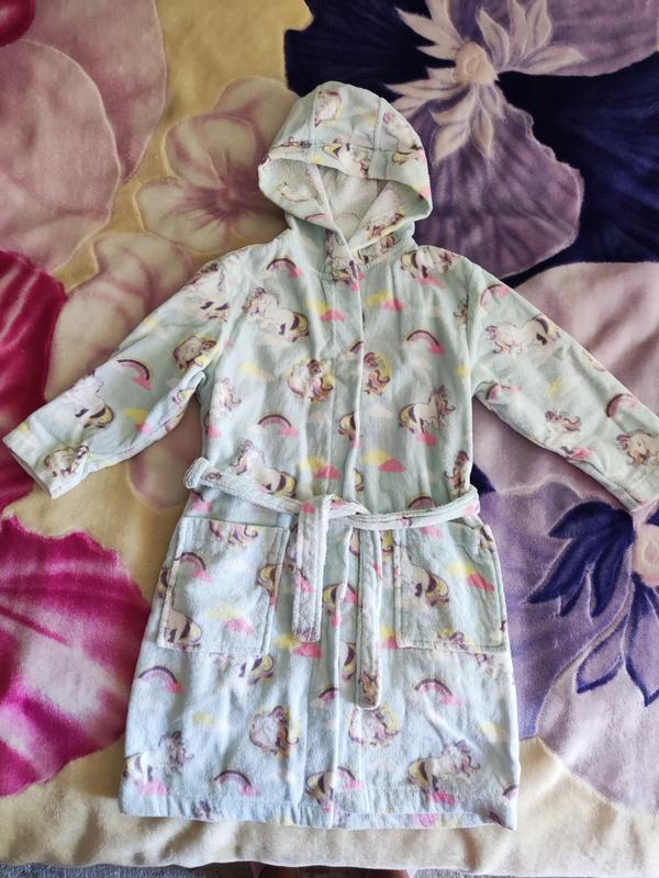 Махровый халат для девочки с 🦄 , натуральная ткань, мягкий, с двумя карманами и капюшоном, рукав 3/4, состояние нового. Замеры: длина 68 см плечи 32 см под рукавами 40 см рукав 35 см.