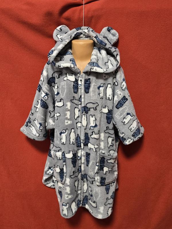 Теплый детский халат на молнии 116-122, на 6-7 лет. Длина 70, рукав 44, ОТ 120. В отличном состоянии, без дефектов. Подойдет как для повседневной носки, так и после купания (имеет теплый капюшон с ушками).