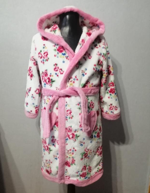 Гарненький халат на дівчинку на зріст 110 /116 см. Довжина 72 см, ширина під руками 40 см, рукав від капюшона 47 см.