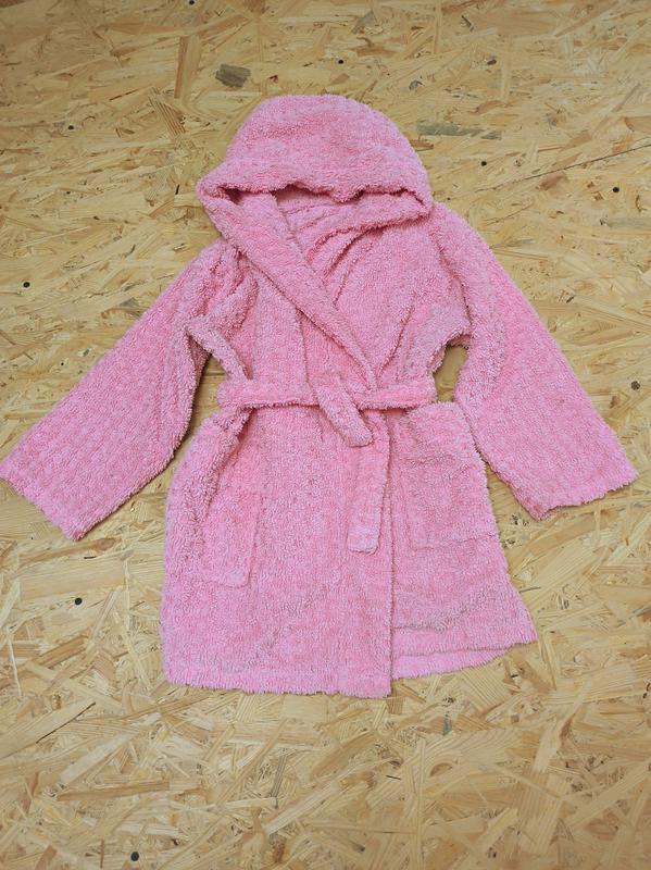 Халатик махровый на девочку. З капюшоном, на запах на пояс. Стан идеален. Размер ориентировочно 110-122. Замеры на фото