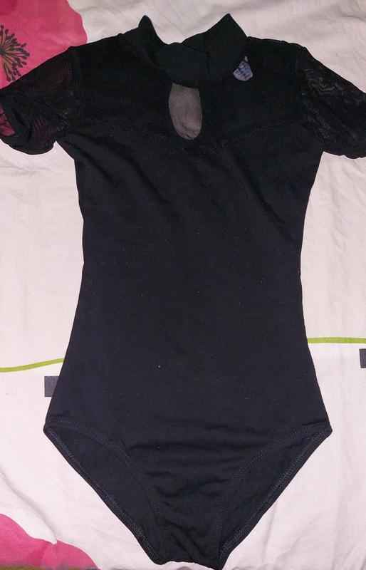 черное боди с короткими кружевными рукавами и сетчатой вставкой на груди.