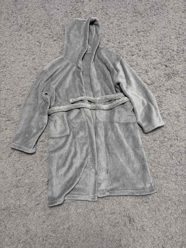 Халат детский, серого цвета, состояние идеальное, есть пояс.Длина 81, плечи 45, рукав 43, длина пояса 131, талия 46.