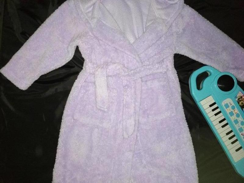 Очень мягкий махровьій халатик сереневого цвета .Подойдет на 5-6лет .Замерьі:ширина плеч 44см,ширина в запахнутом виде по талии 36см(хорошо регулируется запахом),длина от шеи до низка рукава 46см,длина по спинке 73 см.Очень легкий и тепльій.Вашей мальішке понравится.Без нюансов.