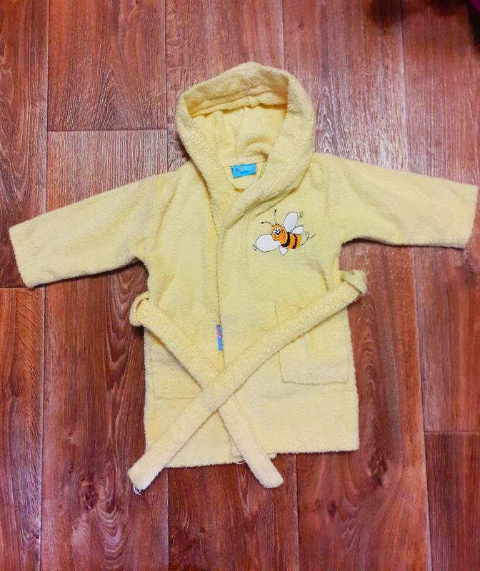Желтенький халат для малышки, без дефектов, в носке был мало .Длина по спинке-48, длина рукава от ворота-33 см