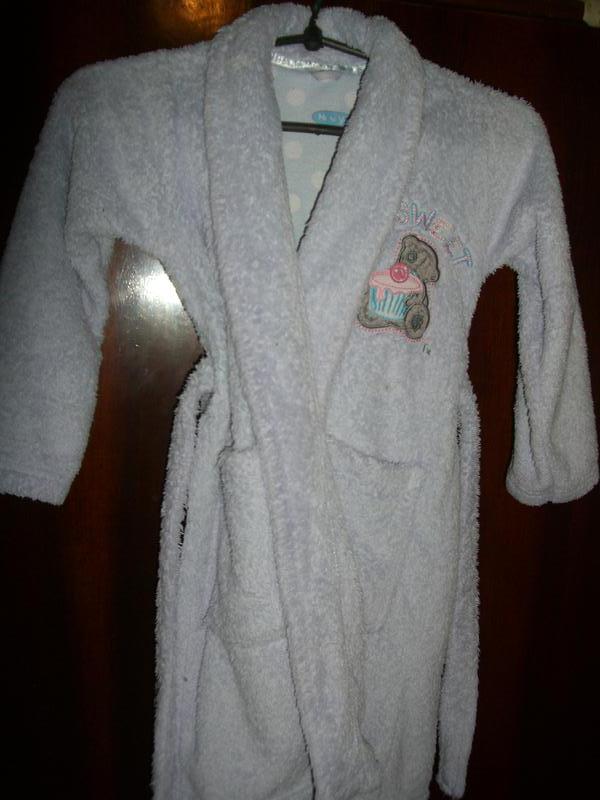 голубой детский флисовый халатик, пояс на спинке на резинке, завязывается на пояс, спереди два карманчика, впереди и сзади милая аппликация мишка Теди и вышивка, рукав длинный, без капюшона. ПОГ 38см, ПОТ 28см, ПОБ 44см, длина 67см, плечо 7см, рукав 48см.