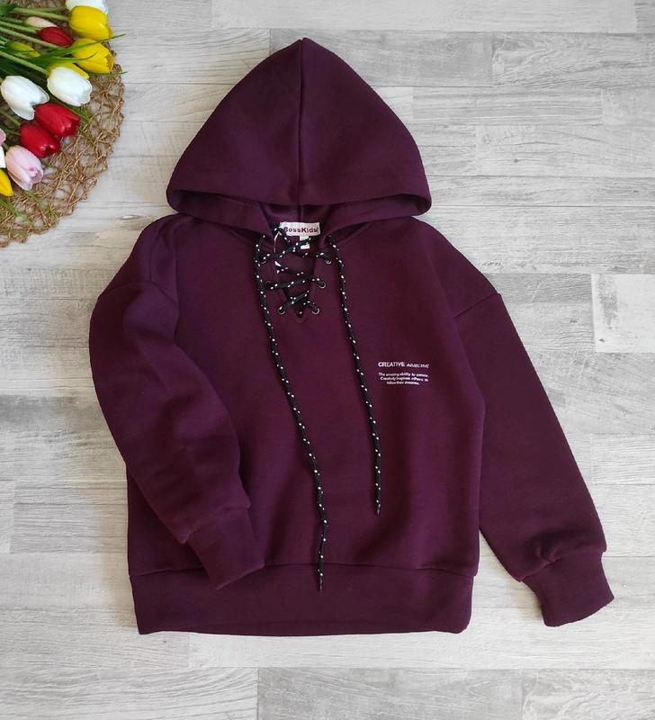 м В наявності 🧡 Модне худі для дівчинки Тканина трьохнитка з начесом Прикрашено шнурочком, вверху стягується ЯКІСТЬ ЧУДОВА! колір вишневий заміри:довжина /рукав від горловини/пог 140р-49/53/44 158р-55/61/51 +-2см 140-1шт 158-1шт