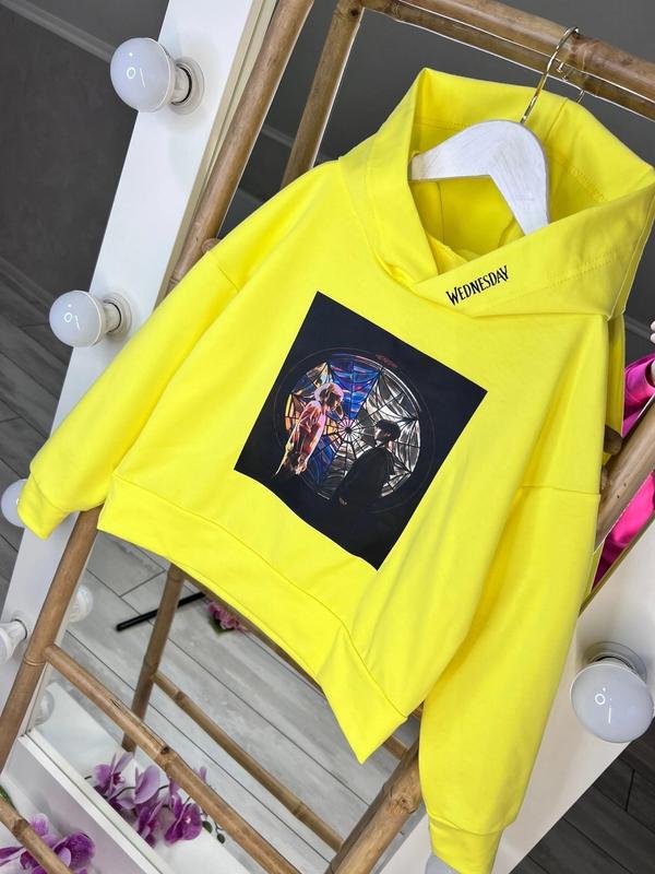 Стильное худи с любимой Wednesday тканина 2нитка худи с капюшоном, на рукавчиках есть манжет, украшенный двойным прорезиненным накатом рекомендую!!! длина/рукав от горловины/ пог 134-47\57\46 140-49\58\47 146-51\60\48 152-53\62\50 158-55\64\52 артmasya÷