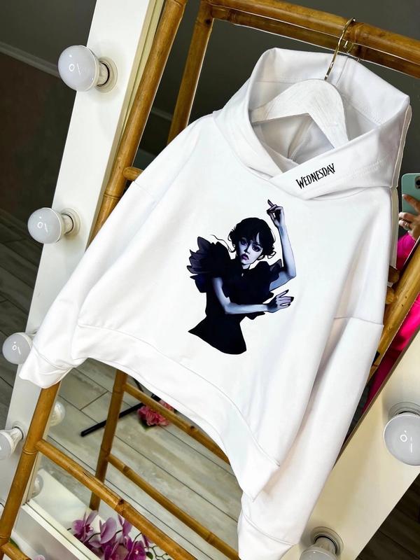 Стильное худи с любимой Wednesday тканина 2нитка худи с капюшоном, на рукавчиках есть манжет, 🪴украшена двойным прорезиненным накатом рекомендую!!! размер/🪴длина/пог/рукав от горловины 134/🪴44/44/55-2шт 140/🪴45/46/56-2шт 146/🪴46/48/58-2шт 152/🪴49/50/59-1шт 158/🪴53/52/61-2шт +-2см