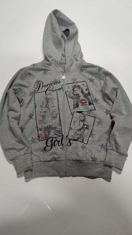 Кофта с капюшоном для девочки. Состояние очень хорошее. Ориентировочно 6-8 лет. Замеры: ПОГ - 39 см Ширина низа по резинке - 32 см, тянется Плечи - 33 см Длина рукава от плеча - 48 см Длина рукава от подмышки - 38 см Длина по спинке от шеи - 48 см Длина с переда по молнии - 42 см