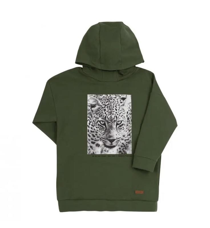 худи, хаки фирма Бемби Новая коллекция детской одежды - весна 2021 Стильное легкое худи для мальчика или девочки. Модель цвета хаки, декорировано принтом с леопардом. Худи с глубоким капюшоном, рукава и низ изделия на манжете. Сшито из хлопкового трикотажа. Материал: 100% хлопок Тип полотна: двунитка Цвет: хаки