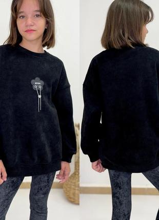 Хороший свитшот Ткань микро-вельвет очень хорошего качества на флисе плотный, очень теплый и приятный к телу цвет черный СУПЕР КАЧЕСТВО! рост/длина/пог/рукав от горловины похибка +-2см 140/58/48/56-1шт 152/60/53/59-2шт 164/64/57/68-1шт