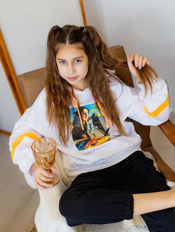 Стильна худі для дівчаток. Худі в білому кольорі з яскравими неоновими написами і малюнком. Ваша дівчинка обов'язково залишиться в захваті від цієї моделі. Склад: 95% бавовна, 5% еластан