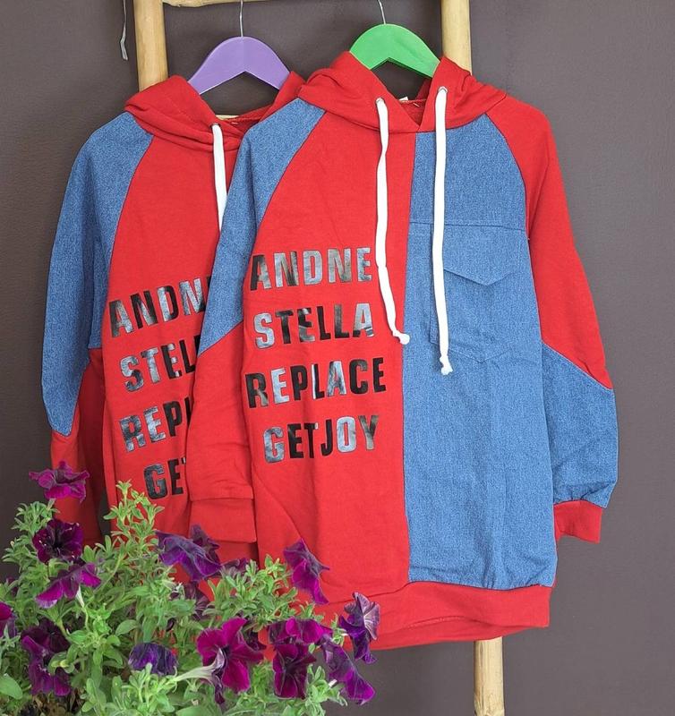 🫶585 грн 🫶 Новиночка 🤩🤩🤩 Супер стильное худи, сочетание 2х видов ткани. Смотрится очень стильно!!! РЕКОМЕНДУЕМ 😍 Ткань: турецкая петля (без флиса! не кошлатится!!! 95 % ХБ + джинс Цвет: красный Принт: прорезиненый 2ной накат. не облазит! ПОЛНОМЕРЫ!!! 140- 2шт 146-3шт 152-4 шт 158-3шт 164- 3шт