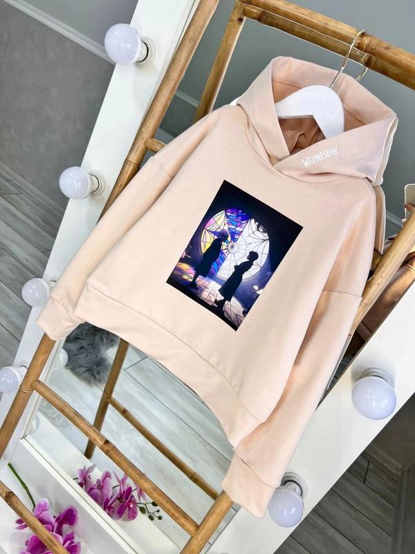 Стильне худі з улюленою Wednesday тканина 2нитка худі з капюшоном, на рукавчиках є манжет, прикрашене подвійним прогумованим накатом 146-51\60\48 152-53\62\50 персик 146,152 блакитний 146,152 жовтий 152