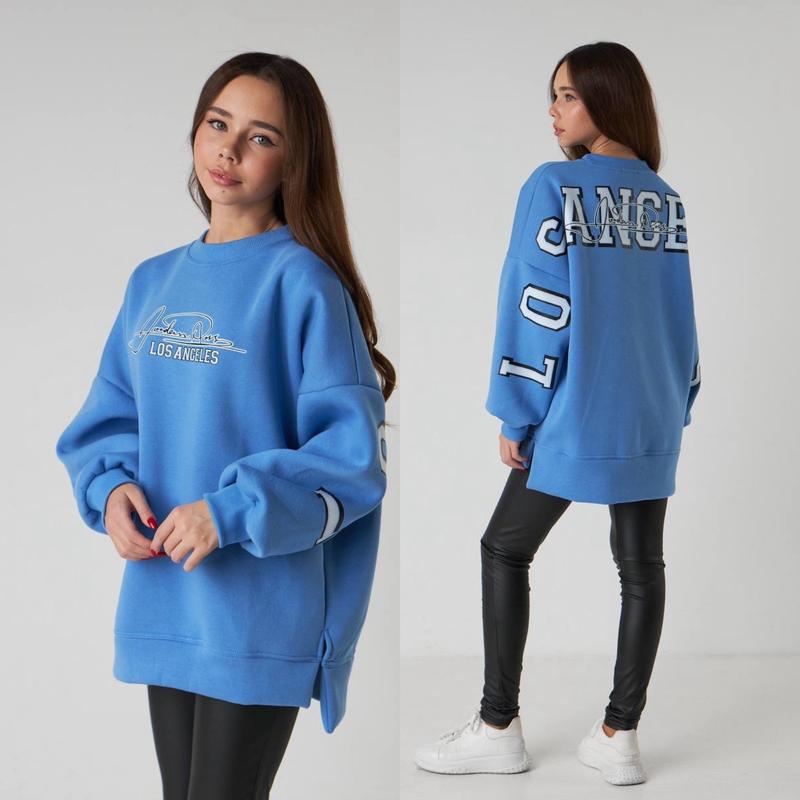 Свитшот "LOS ANGELES" по бокам небольшие разрезы объемный рукав выглядит необычайно красиво и стильно ткань качественная трехнитка ПЕНЬЕ на флисе манжеты и горловина измельченная не подвержена появлению катышков РЕКОМЕНДУЮ!!! цена 885 грн рост/длина по переду/пог/рукав от горловины похибка+-2см 140/60/57/56-1шт 146/62/59/58-1шт 152/65/60/60-1шт 158/67/61/64-1шт 164/69/63/68-1шт