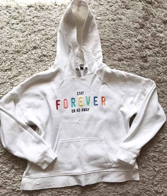 Худи белого цвета с надписью, теплое, KIABI, Испания, разм.138-143см, состав: котон 80%, по бокам снизу разрезы, капюшон, очень хорошее состояние, 250грн.